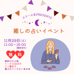 - 11/29(土)開催♡♥ 深まる秋の【癒しの占いイベント】トータル25分のミニ鑑定が無料で受けられる♥♡ 占いで心をすっきり癒して、年末年始へ向かいましょう!