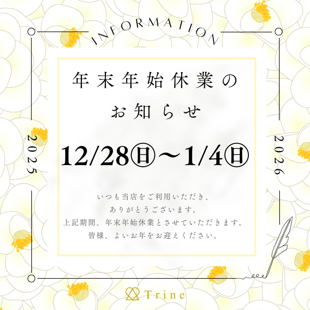 休業中にいただきましたお問い合わせは、2026年1月5日(月)より対応いたします。 ※ご予約につきましては、適宜対応いたします。