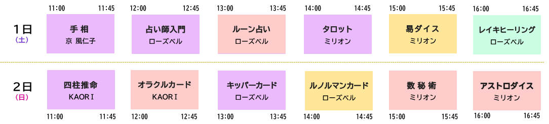 2日間パス | 6,500 円 | 両日とも ①占いクイック講座[45分]:フリー ②占いミニ鑑定[15分]:フリー とてもお得に、2日間満喫できます✨ |
