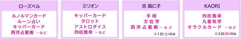手相 | ・心と身体のいまの状態(コンディション) ・いまの運勢や年齢ごとの運気 ・基本的な性格や資質、持っている才能 …など | 京 風仁子 (1日(土)のみ出演) |