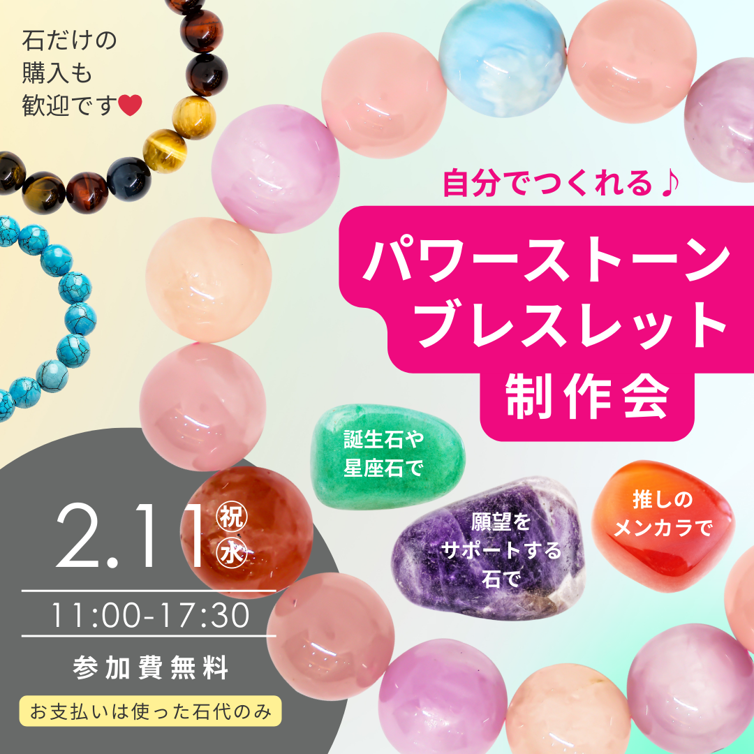 【特別イベント】2/11(祝・水)開催☆叶えたい願いごとで🌟 直感で自分の好きに🍀 誕生石や星座にちなんで💫 推しのメンカラで💕「自分で選んで、自分でつくる」パワーストーンブレスレット制作会