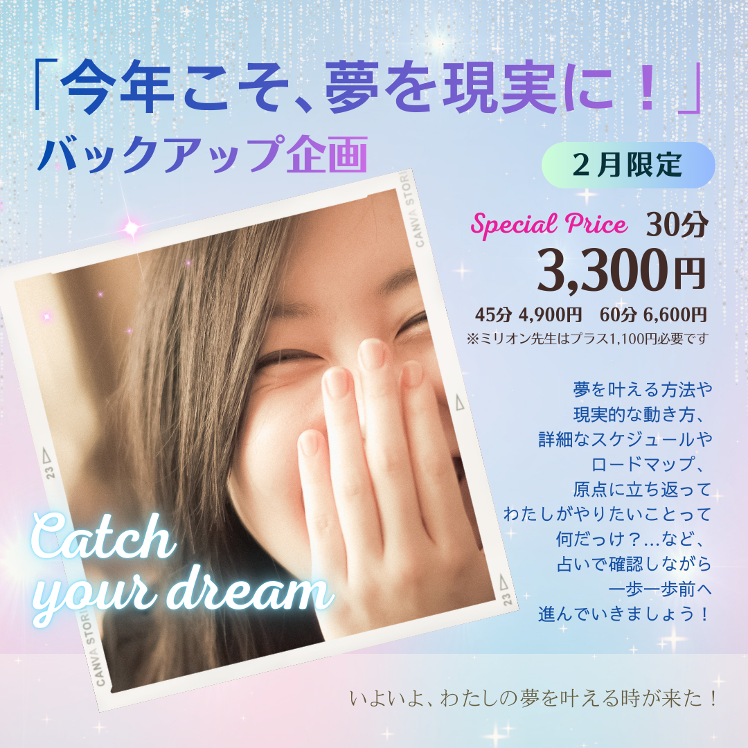 【2月限定・テーマ占い②】夢の実現に向けて決断&行動したい人も、自分の夢をはっきりとさせたい方も、「今年こそ、夢を現実に!」バックアップ企画で力強くサポートします🌟《スペシャル価格 :30分・ 3,300円~》お子様連れ・オンライン対応も可能❣️