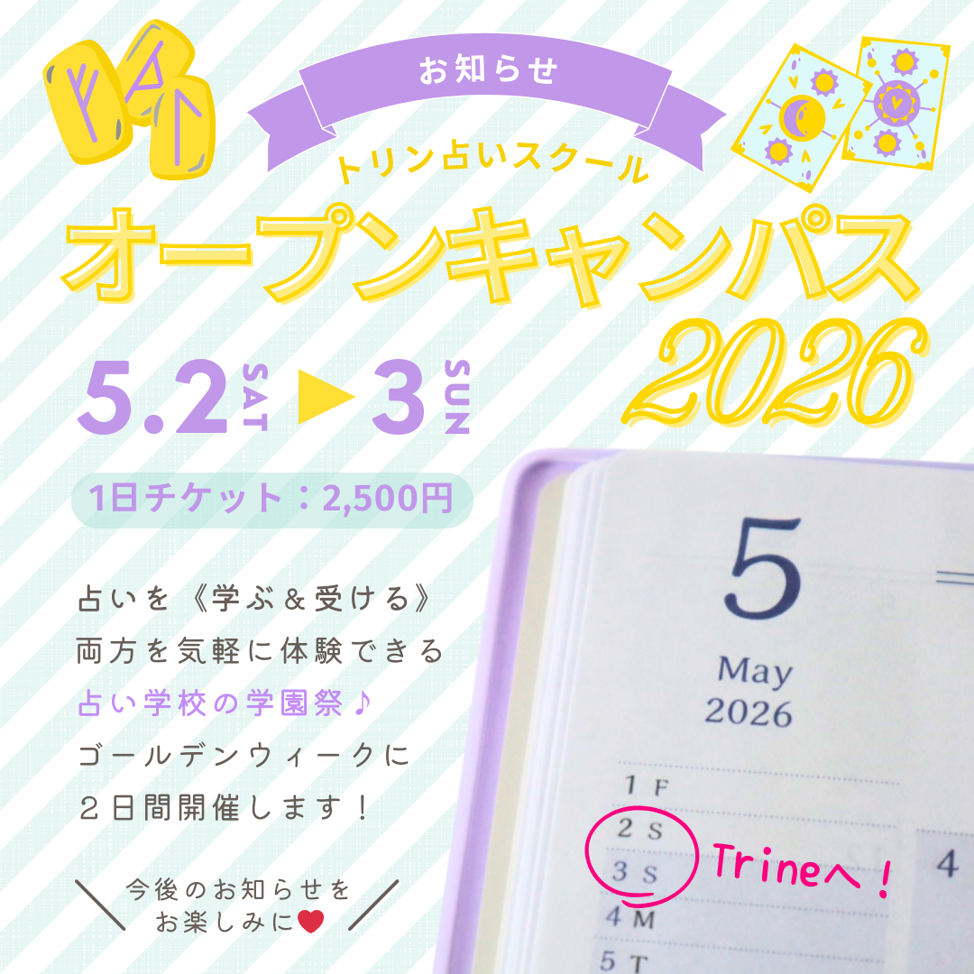 - 憧れの「プロ占い師」への第一歩を踏み出そう🌟スクールイベントでの「占いミニ鑑定」の出演者を募集します🔮【トリン占いスクール オープンキャンパス2026】 2026年5月2日(土)・3日(日・祝)開催